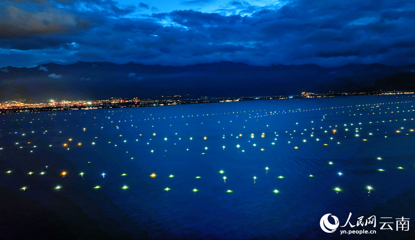 Photo shows Erhai Lake in Dali Bai Autonomous Prefecture, southwest China's Yunnan Province, dotted with fishing lights during the annual ecological regulation of fish populations in the lake in 2023. (Photo/Dong Mengliang)