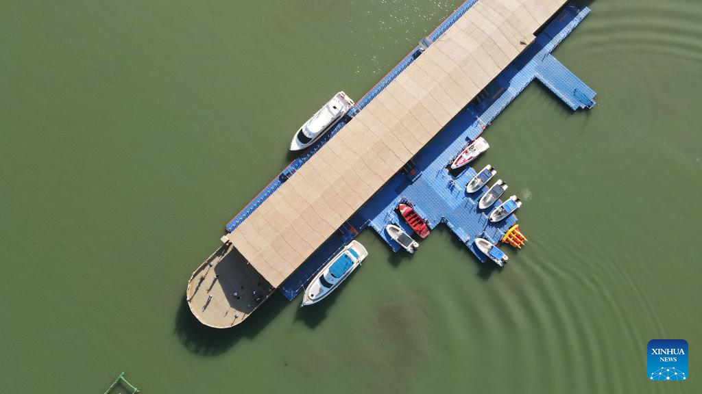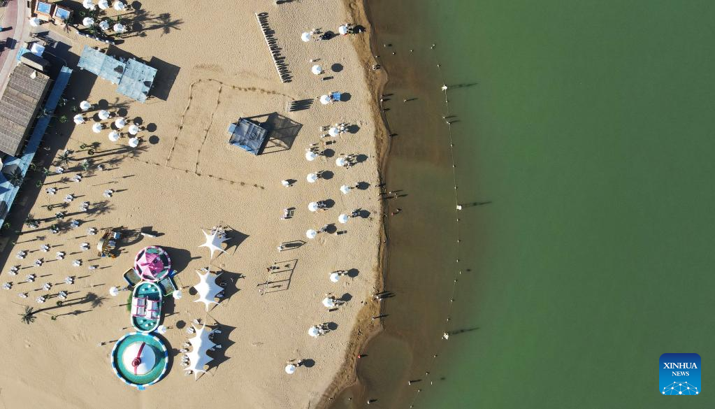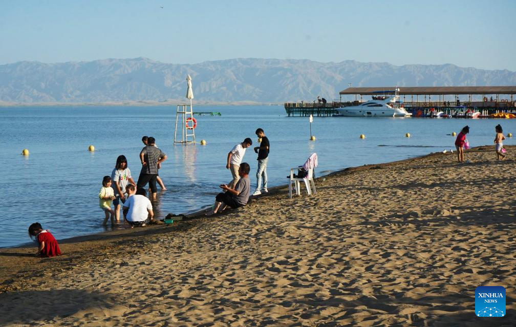 This aerial photo taken on Aug. 31, 2023 shows tourists visiting the Dahekou scenic spot of Bosten Lake in Bohu County, northwest China's Xinjiang Uygur Autonomous Region. The Bosten Lake covering an area of 1,646 square kilometers is the largest inland freshwater lake in China. (Xinhua/Jin Haoyuan)