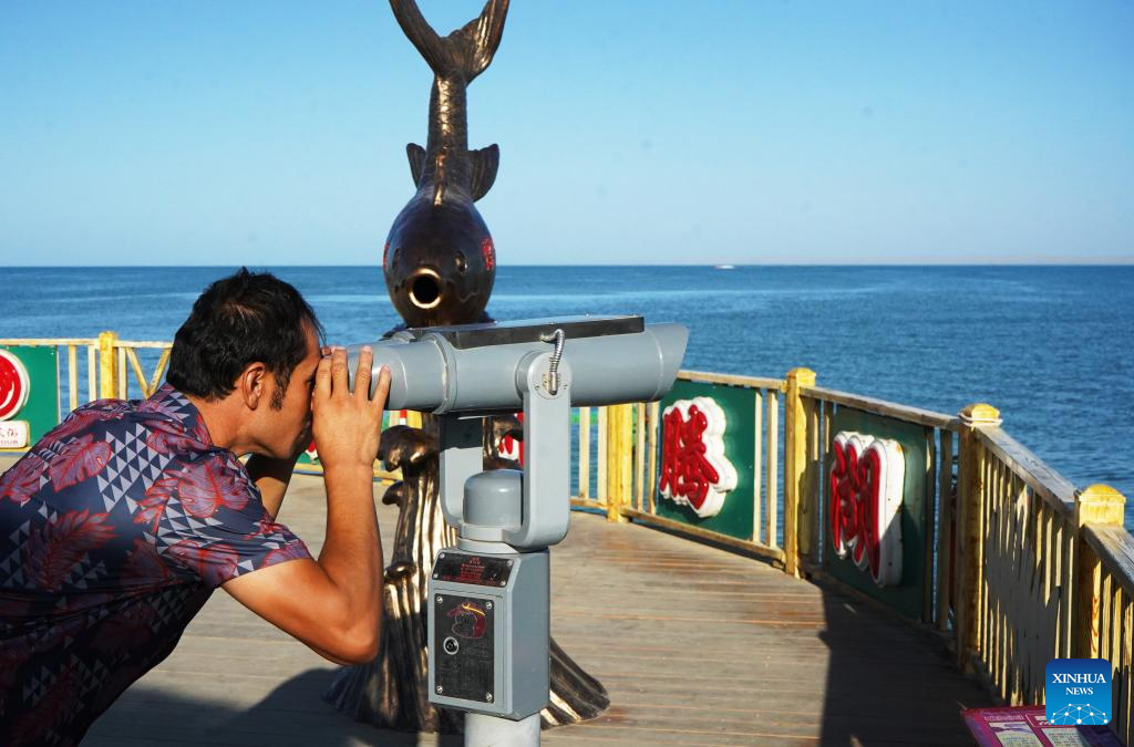 A tourist uses a telescope to watch views at the Dahekou scenic spot of Bosten Lake in Bohu County, northwest China's Xinjiang Uygur Autonomous Region, Aug. 31, 2023. The Bosten Lake covering an area of 1,646 square kilometers is the largest inland freshwater lake in China. (Xinhua/Jin Haoyuan)