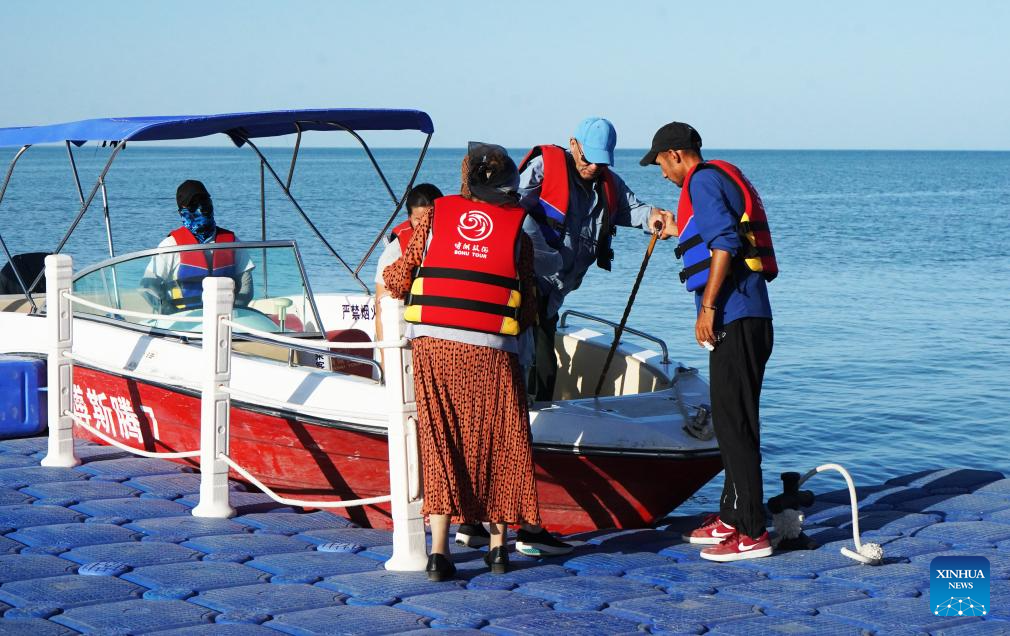 Tourists get off a boat at the Dahekou scenic spot of Bosten Lake in Bohu County, northwest China's Xinjiang Uygur Autonomous Region, Aug. 31, 2023. The Bosten Lake covering an area of 1,646 square kilometers is the largest inland freshwater lake in China. (Xinhua/Jin Haoyuan)