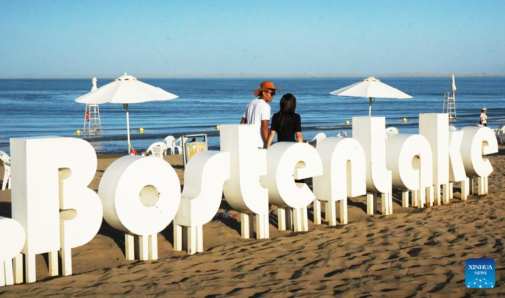 Tourists pose for photos at the Dahekou scenic spot of Bosten Lake in Bohu County, northwest China's Xinjiang Uygur Autonomous Region, Aug. 31, 2023. The Bosten Lake covering an area of 1,646 square kilometers is the largest inland freshwater lake in China. (Xinhua/Jin Haoyuan)