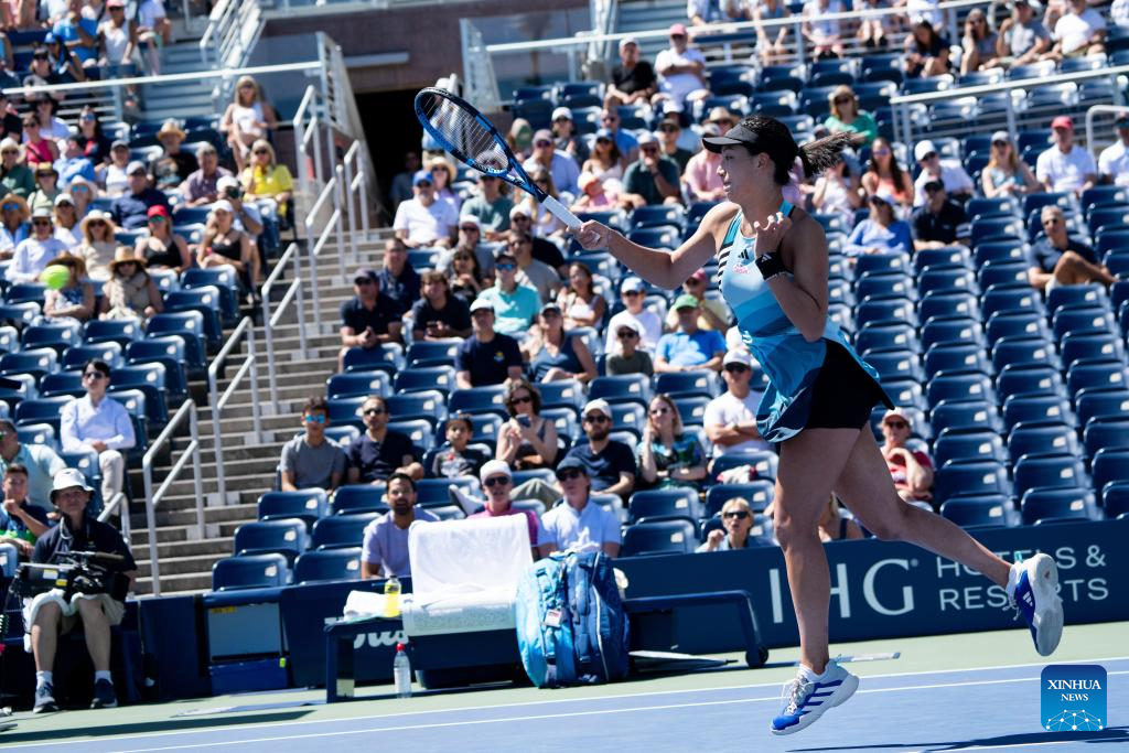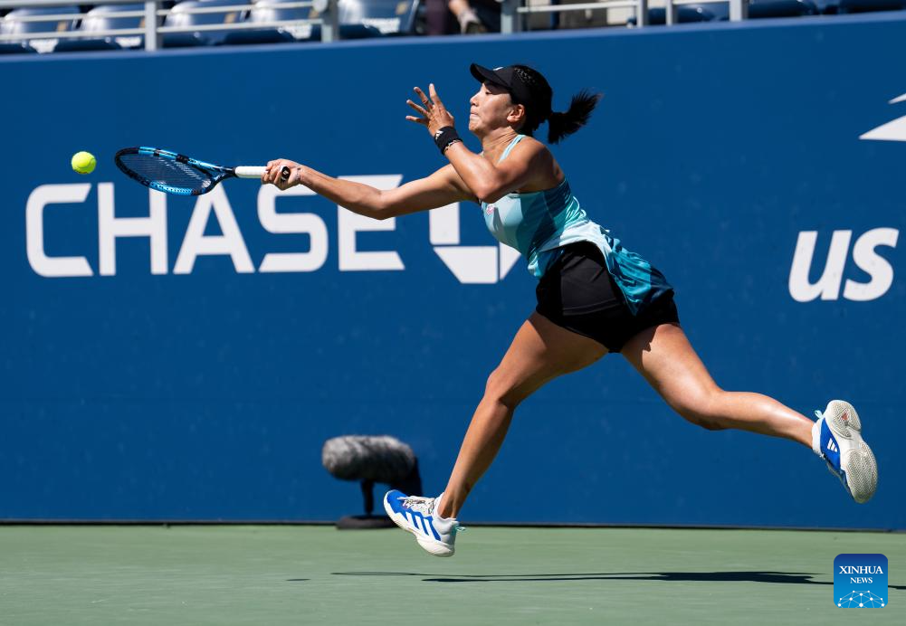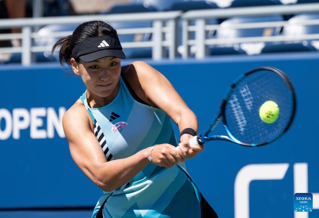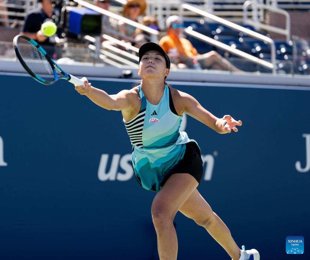 Wang Xinyu of China hits a return during the women's singles third round match against Anna Karolina Schmiedlova of Slovakia at the 2023 US Open tennis championships in New York, the United States, Sept. 1, 2023. (Xinhua/Liu Jie)