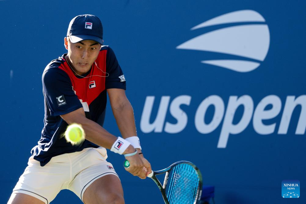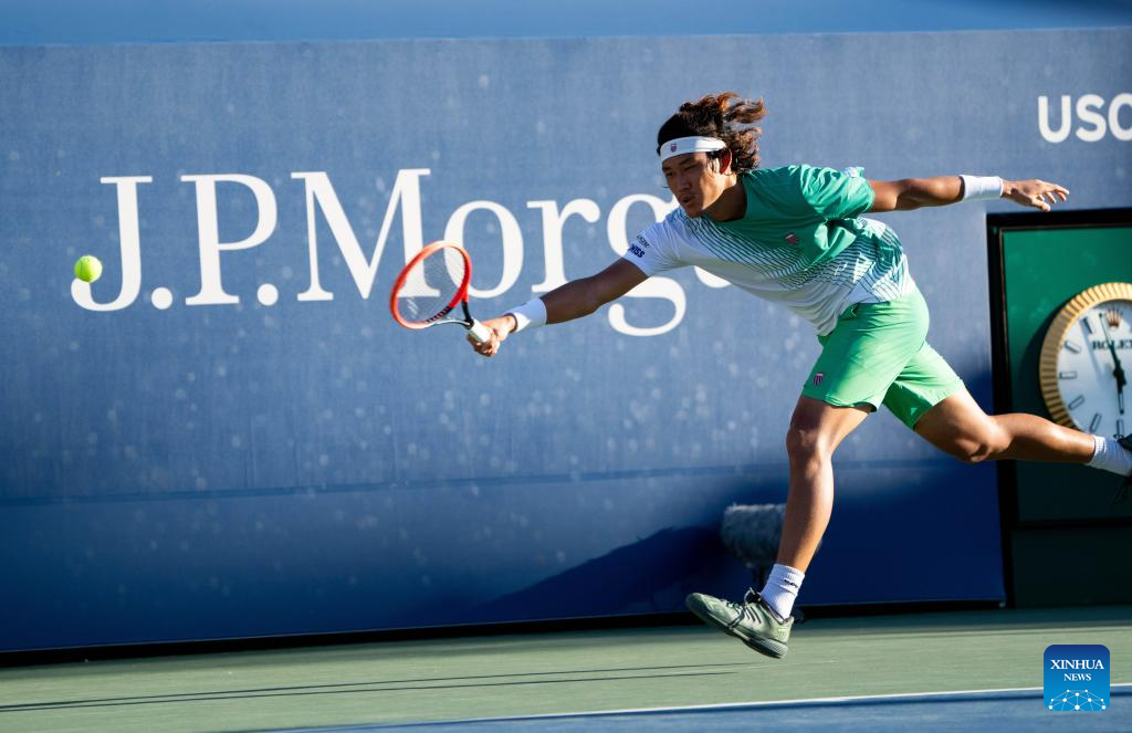 Zhang Zhizhen of China hits a return during the men's singles third round match against Rinky Hijikata of Australia at the 2023 US Open tennis championships in New York, the United States, Sept. 1, 2023. (Xinhua/Liu Jie)