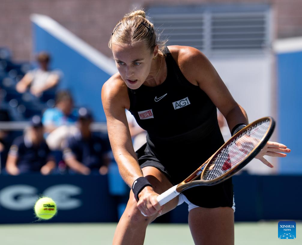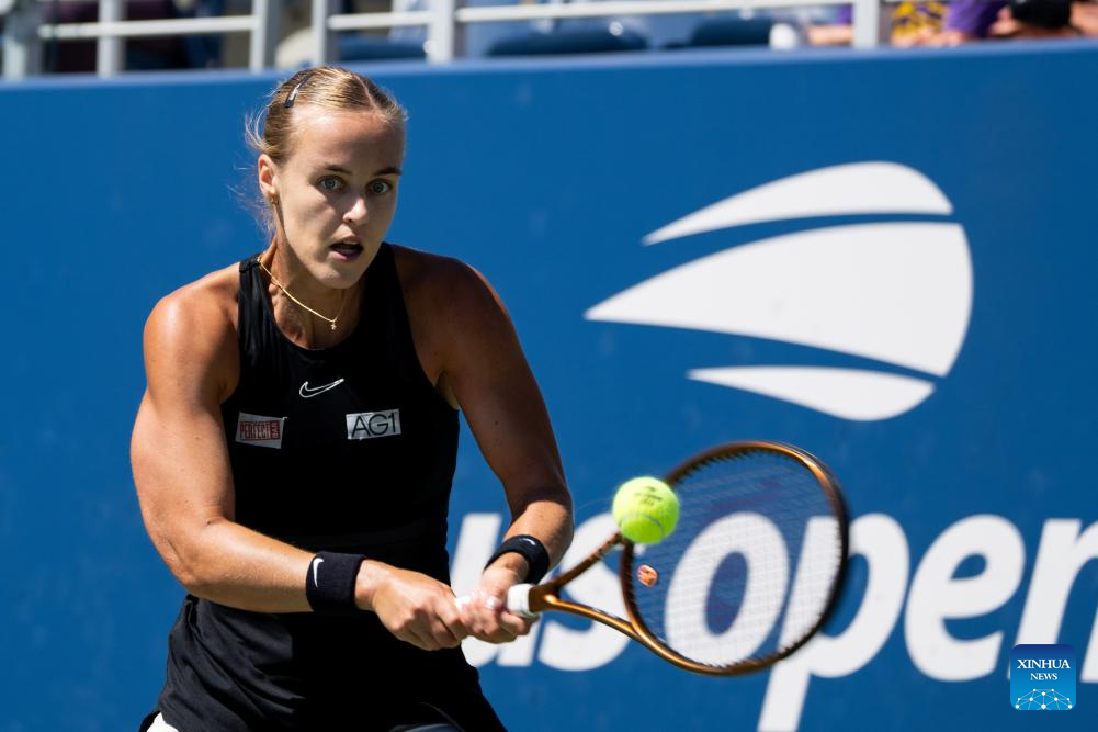 Anna Karolina Schmiedlova of Slovakia hits a return during the women's singles third round match against Wang Xinyu of China at the 2023 US Open tennis championships in New York, the United States, Sept. 1, 2023. (Xinhua/Liu Jie)