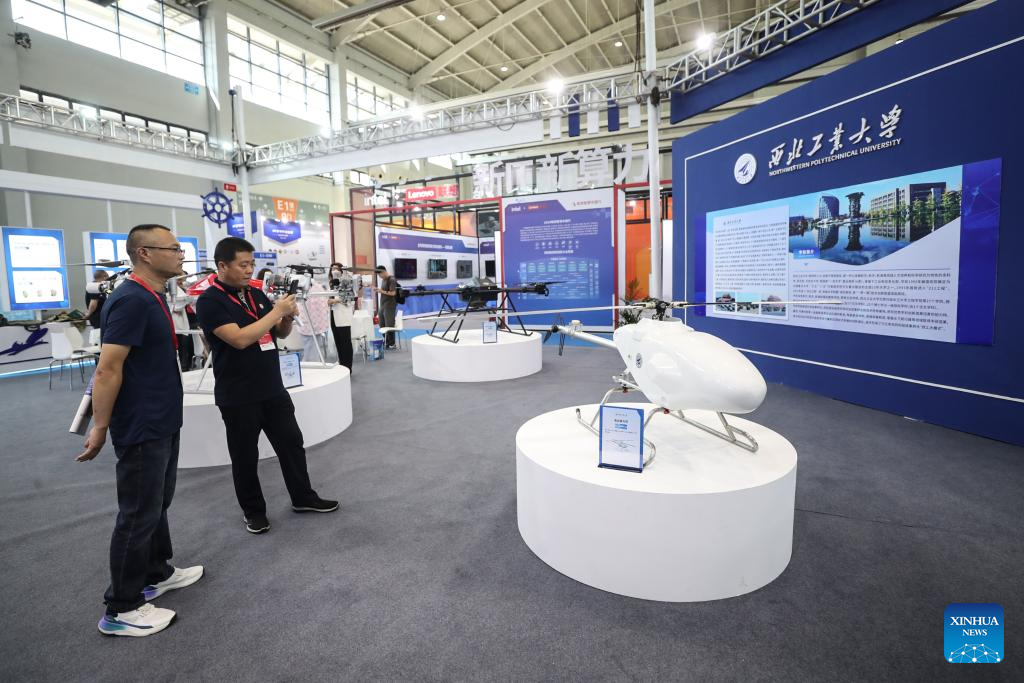 Visitors view an electric helicopter displayed at the 21st China International Equipment Manufacturing Exposition in Shenyang, northeast China's Liaoning Province, Sept. 1, 2023. The expo kicked off on Friday at Shenyang International Exhibition Center. Over a thousand enterprises in intelligent manufacturing area attended the expo. (Xinhua/Pan Yulong)