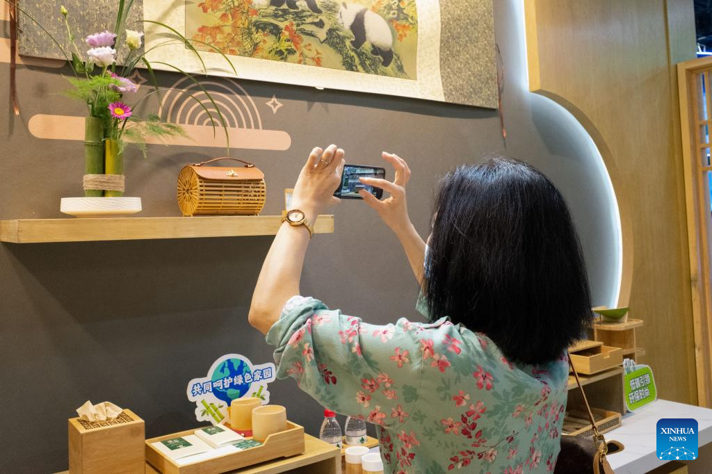 A visitor takes photos of bamboo exhibits at the China National Convention Center in Beijing, capital of China, Sept. 1, 2023.