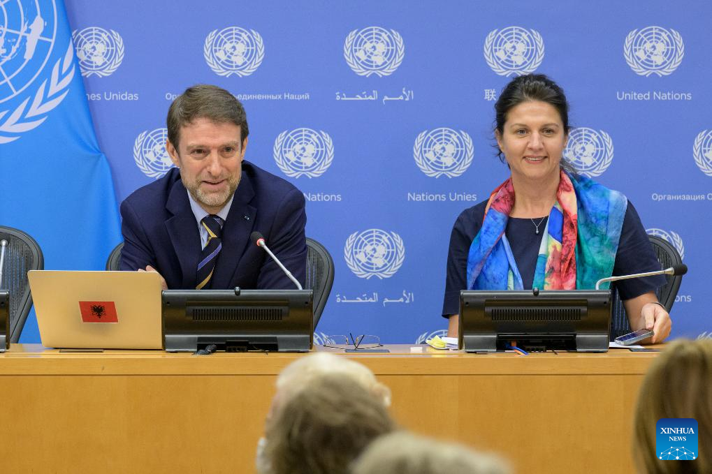 Ferit Hoxha (L), Albania's UN ambassador, whose country holds the Security Council presidency for the month, briefs reporters at the UN headquarters in New York, on Sept. 1, 2023. Ukrainian President Volodymyr Zelensky is expected to come to the United Nations headquarters in September, said Ferit Hoxha. (Manuel Elas/UN Photo/Handout via Xinhua)