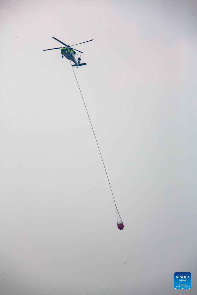 A helicopter carries water to put out a large wildfire near Huntsville in Walker County, Texas, the United States, on Sept. 2, 2023. A fast-spreading wildfire near Huntsville, east Texas, triggered evacuation and a highway closure on Friday night, according to the emergency authorities. (Photo by Lao Chengyue/Xinhua)