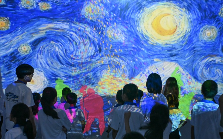 "Sunflowers" swaying in the wind, and the "stars" and "moon" twinkling in the "night sky," the paintings of Vincent van Gogh, one of the most famous and prolific Dutch artists, seem to come alive in the giant immersive areas in the Tianjin Digital Art Museum. Tourists look like they are standing in the paintings when they admire the artworks thanks to digital technologies.