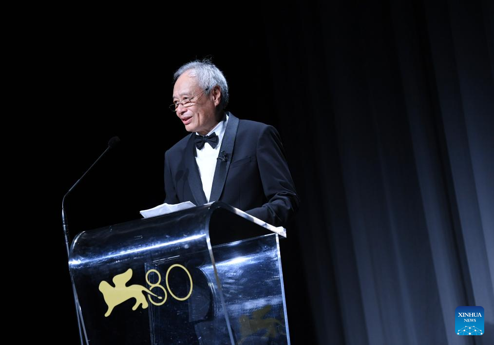 Director Ang Lee delivers a speech at an award ceremony during the 80th Venice International Film Festival in Venice, Italy, on Sept. 2, 2023. Actor Tony Leung Chiu-Wai of Hong Kong, China was presented with the Golden Lion for Lifetime Achievement during the event on Saturday. (Xinhua/Jin Mamengni)