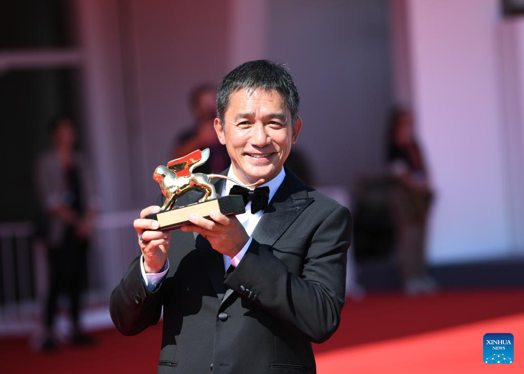 Actor Tony Leung Chiu-Wai poses with his trophy during the 80th Venice International Film Festival in Venice, Italy, on Sept. 2, 2023. Tony Leung Chiu-Wai of Hong Kong, China was presented with the Golden Lion for Lifetime Achievement during the event on Saturday. (Xinhua/Jin Mamengni)