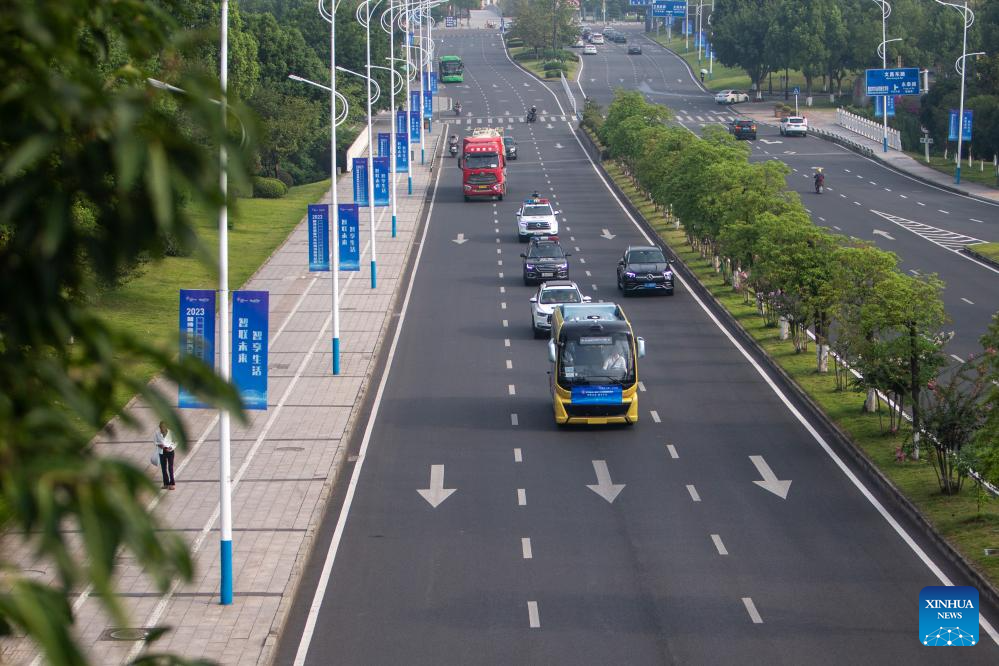 A self-driving bus (front) takes part in the Smart China Expo Smart Automobile Scenario Challenge in Yongchuan District of southwest China's Chongqing, Sept. 2, 2023. The challenge was held in Yongchuan District of Chongqing from Sept. 1 to 3. More than 180 industry representatives and 19 teams from the field of intelligent vehicles participated in the competition. (Xinhua/Chu Jiayin)