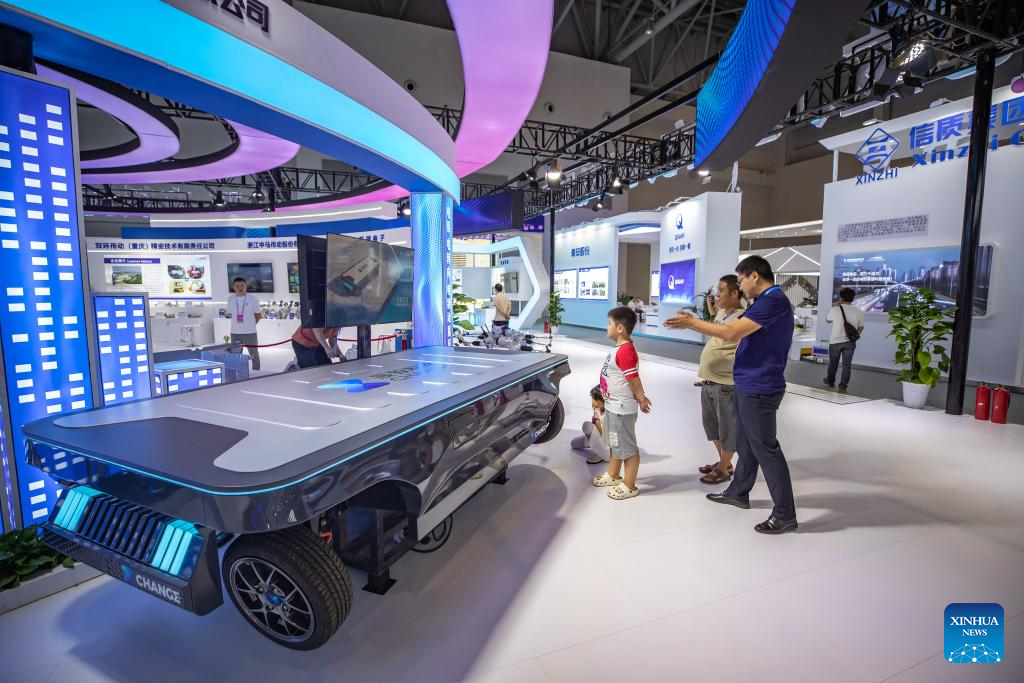 Visitors look at a skateboard chassis used on smart vehicles at the venue for 2023 Smart China Expo in southwest China's Chongqing, Sept. 3, 2023. The 2023 Smart China Expo will be held at Chongqing International Expo Center from Sept. 4 to 6. (Xinhua/Huang Wei)