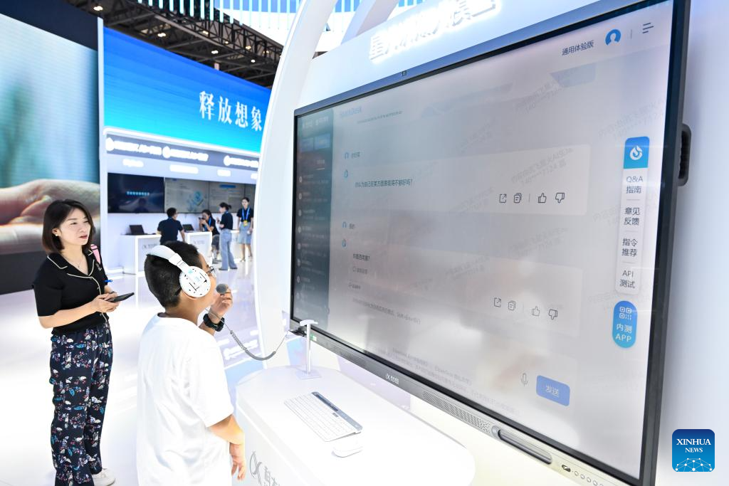 A boy experiences the AI-powered large language model dubbed "Spark Desk", a generative language model launched by iFlytek, a leading Chinese AI company, at the venue for 2023 Smart China Expo in southwest China's Chongqing, Sept. 3, 2023. The 2023 Smart China Expo will be held at Chongqing International Expo Center from Sept. 4 to 6. (Xinhua/Wang Quanchao)