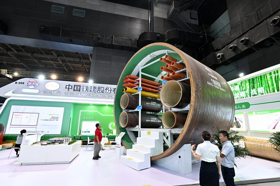 Traders learns about bamboo winding composite pipes at the environmental services exhibition of the 2023 China International Fair for Trade in Services (CIFTIS) in Beijing, capital of China, Sept. 2, 2023. (Xinhua/Li Xin)