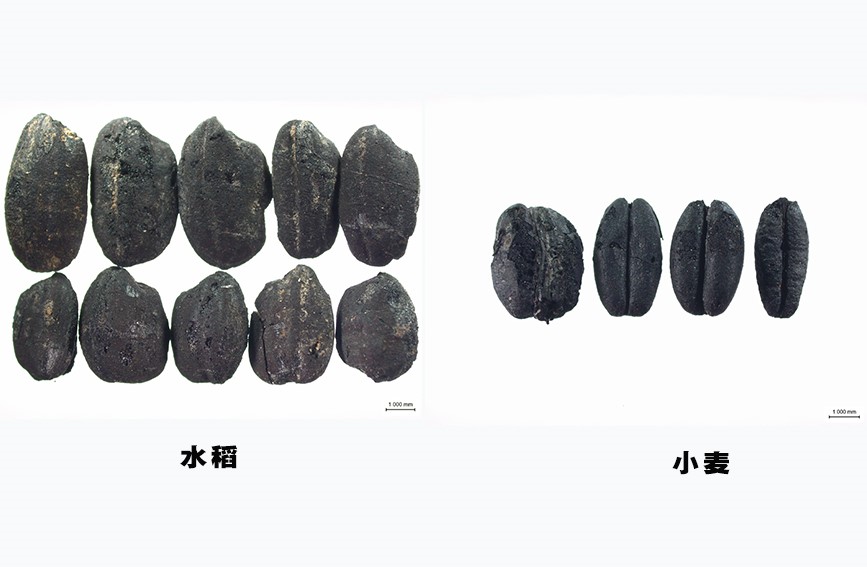 Photo shows carbonized grains of rice (left) and wheat found at the ruins of a settlement site named Gucheng Village site, which is located beside Dianchi Lake in Kunming, southwest China's Yunnan Province. (Photo courtesy of Yunnan Institute of Cultural Relics and Archaeology)
