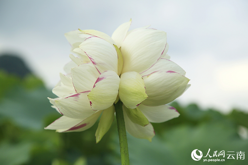 Photo shows a twin lotus flower of "Xiaosajin," a variety also known as small versicolor lotus flower, at the Puzhehei scenic spot in Qiubei county, southwest China's Yunnan Province. (Photo/Li Haolan)