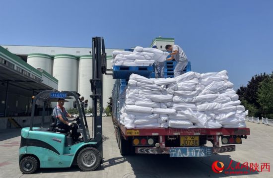 Workers of the Xi'an Aiju Grain and Oil Industrial Group load a truck with goods. (People's Daily Online/Jia Kailu)