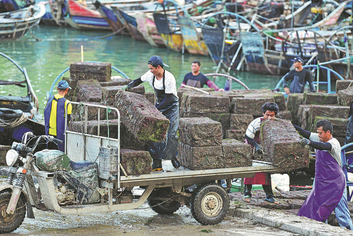 Fishermen load crates filled with abalones onto a motor tricycle at Songluwan port in Lianjiang county in Fuzhou, Fujian, on July 11. ZHANG BIN/FOR CHINA DAILY