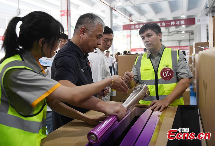 Staff members check the torch for the 19th Asian Games, Sept 4, 2023. (Photo: China News Service/Wang Gang)