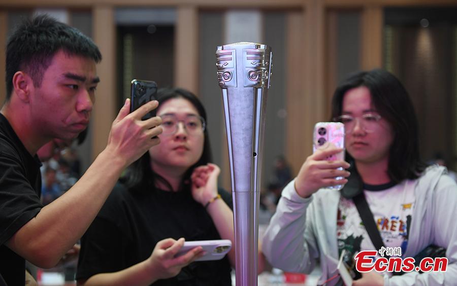 People take a photo of the torch for the 19th Asian Games in Ningbo, Zhejiang Province, Sept 4, 2023. (Photo: China News Service/Wang Gang)