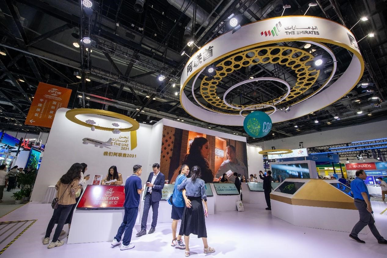 Photo taken on Sept. 2 shows the pavilion of the United Arab Emirates at the China International Fair for Trade in Services 2023. (People's Daily Online/Weng Qiyu)
