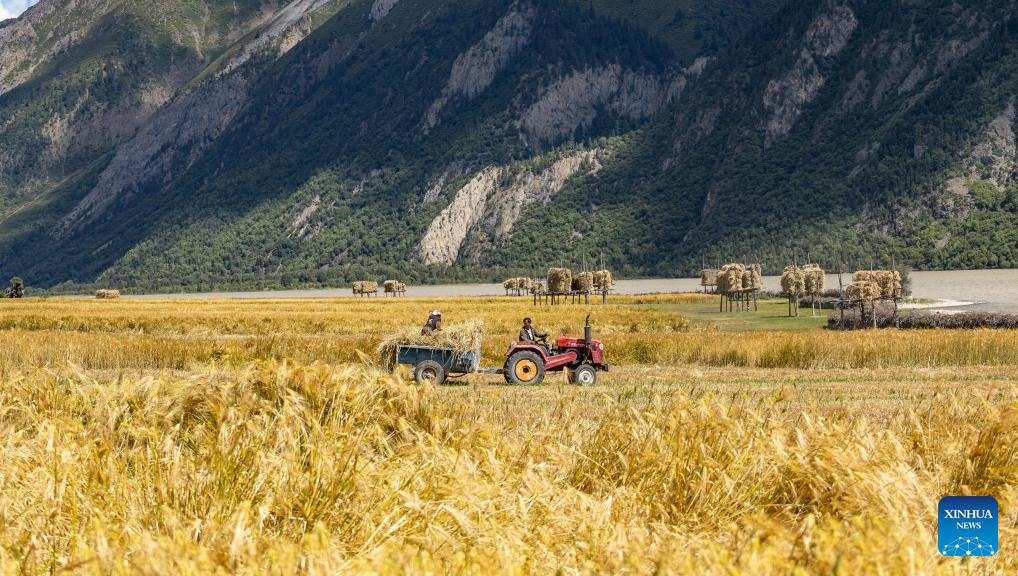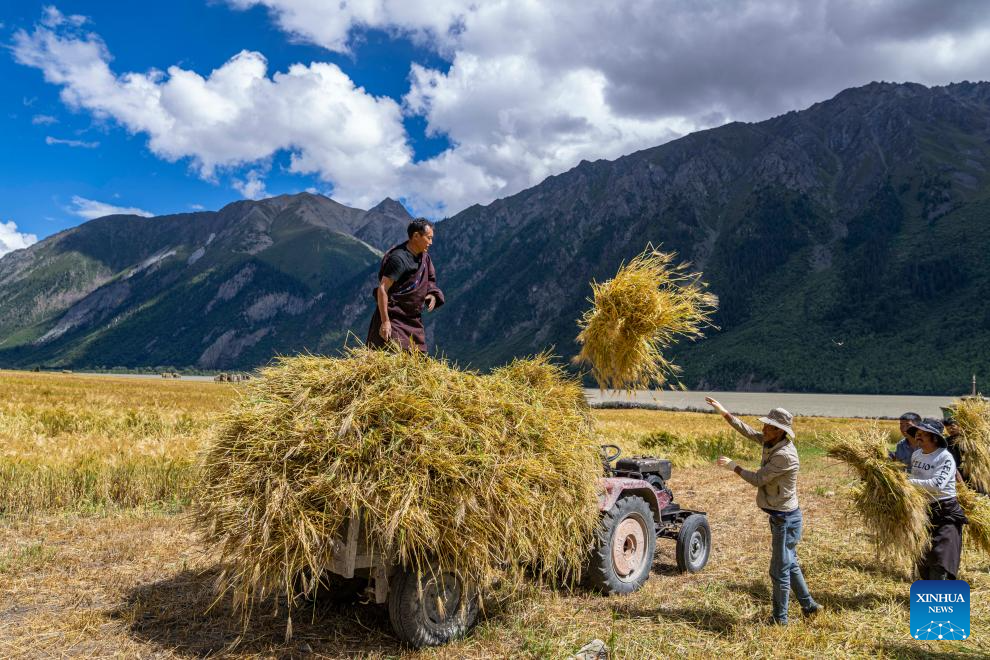 Villagers load highland barley onto a tractor in Waba Village of Ra'og Town of Qamdo City, southwest China's Tibet Autonomous Region, Sept. 4, 2023. (Xinhua/Sun Fei)