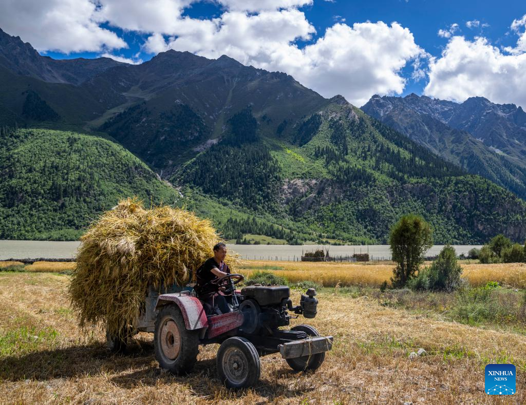 A villager driving a tractor transports highland barley in Waba Village of Ra'og Town of Qamdo City, southwest China's Tibet Autonomous Region, Sept. 4, 2023. (Xinhua/Sun Fei)
