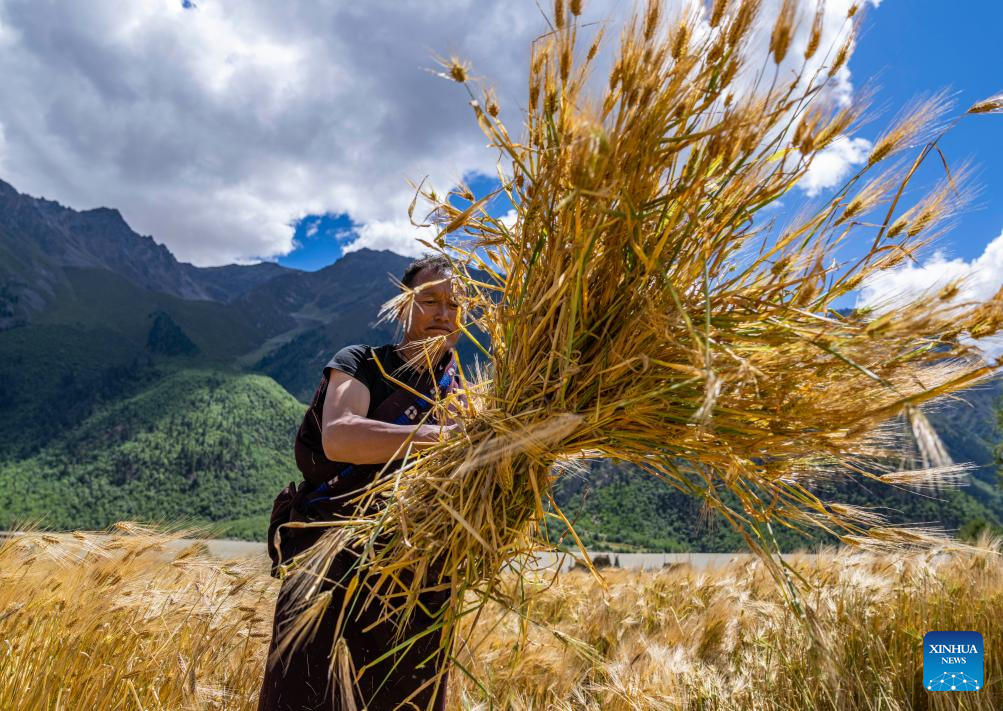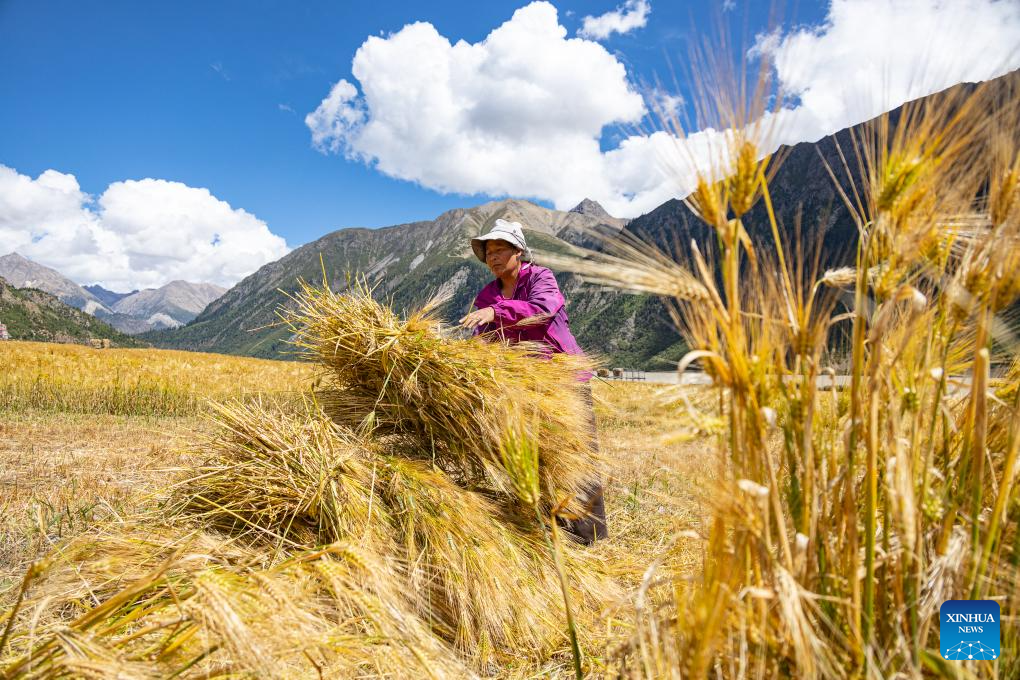 A villager bundles highland barley in Waba Village of Ra'og Town of Qamdo City, southwest China's Tibet Autonomous Region, Sept. 4, 2023. (Photo by Tenzin Nyida/Xinhua)