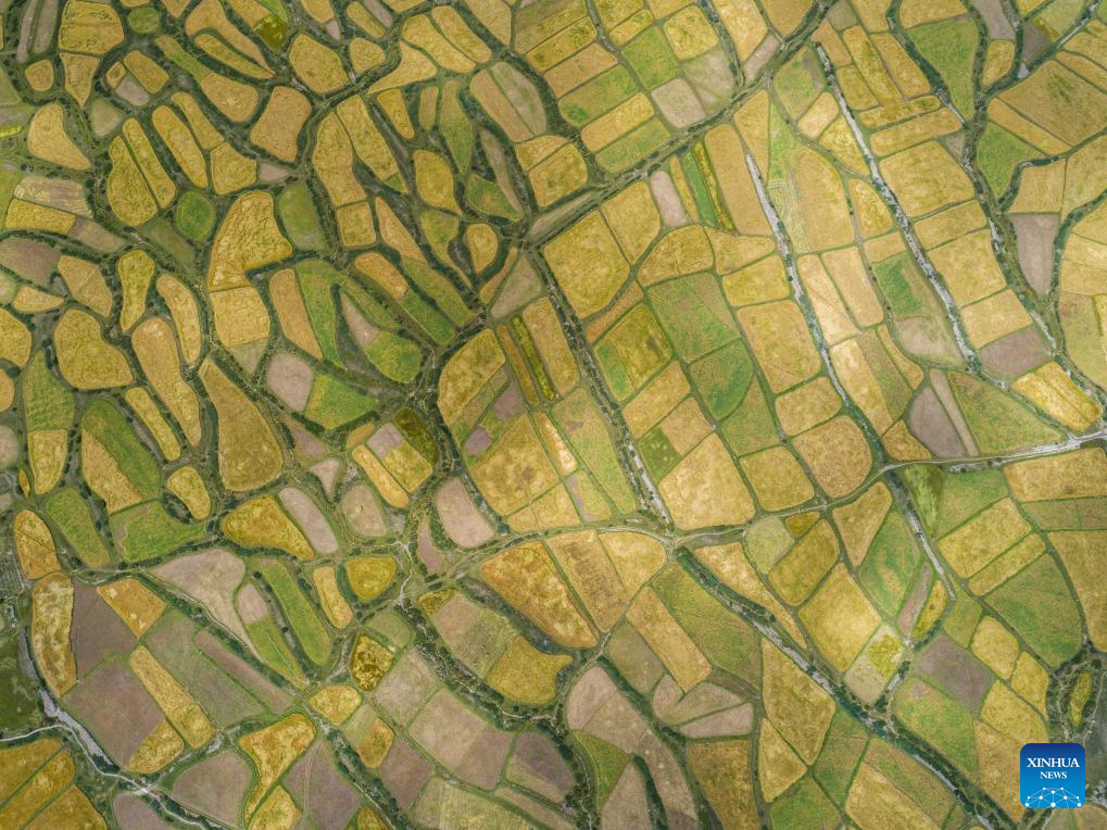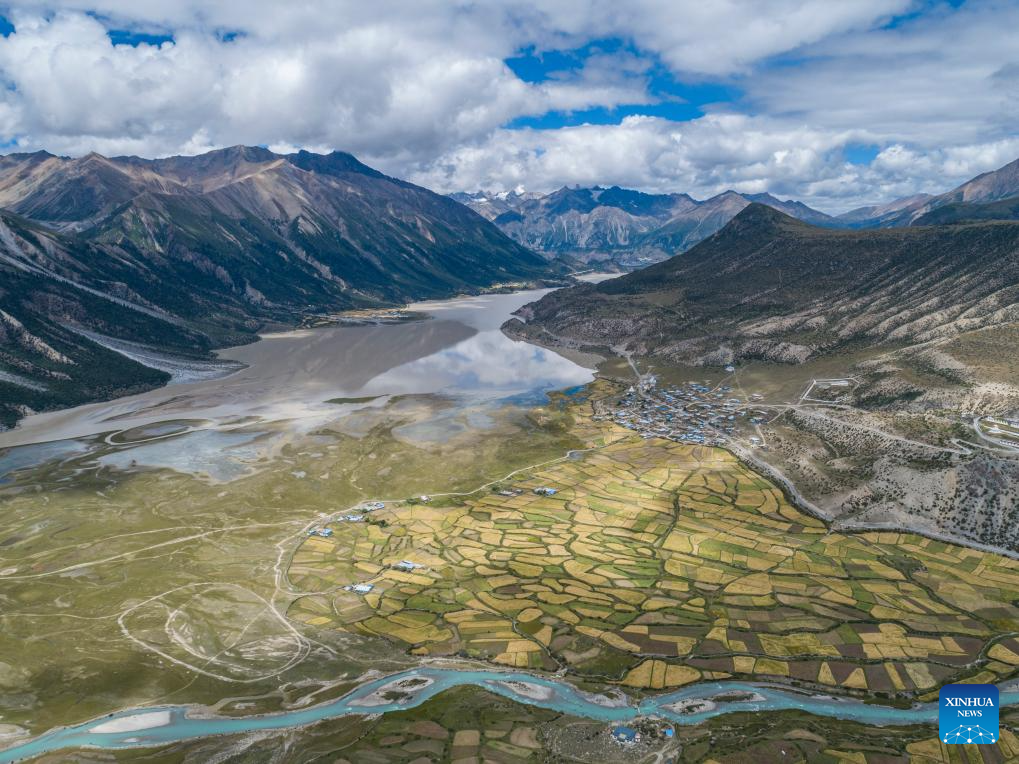 This aerial photo taken on Sept. 4, 2023 shows the farmland along the Ra'og Lake in Qamdo City, southwest China's Tibet Autonomous Region. (Xinhua/Sun Fei)