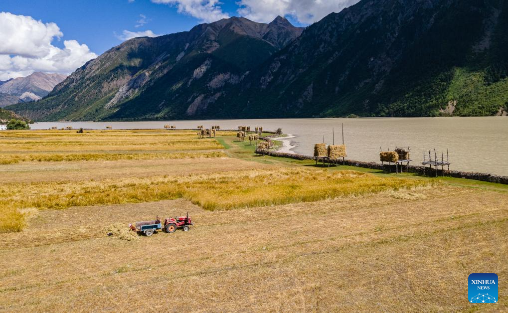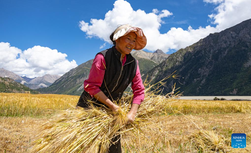 Villagers harvest highland barley in Waba Village of Ra'og Town of Qamdo City, southwest China's Tibet Autonomous Region, Sept. 4, 2023. (Photo by Tenzin Nyida/Xinhua)
