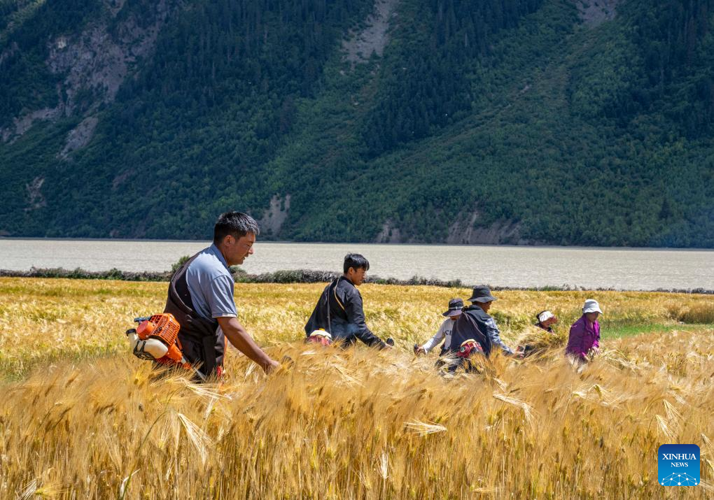Villagers harvest highland barley in Waba Village of Ra'og Town of Qamdo City, southwest China's Tibet Autonomous Region, Sept. 4, 2023. (Xinhua/Sun Fei)