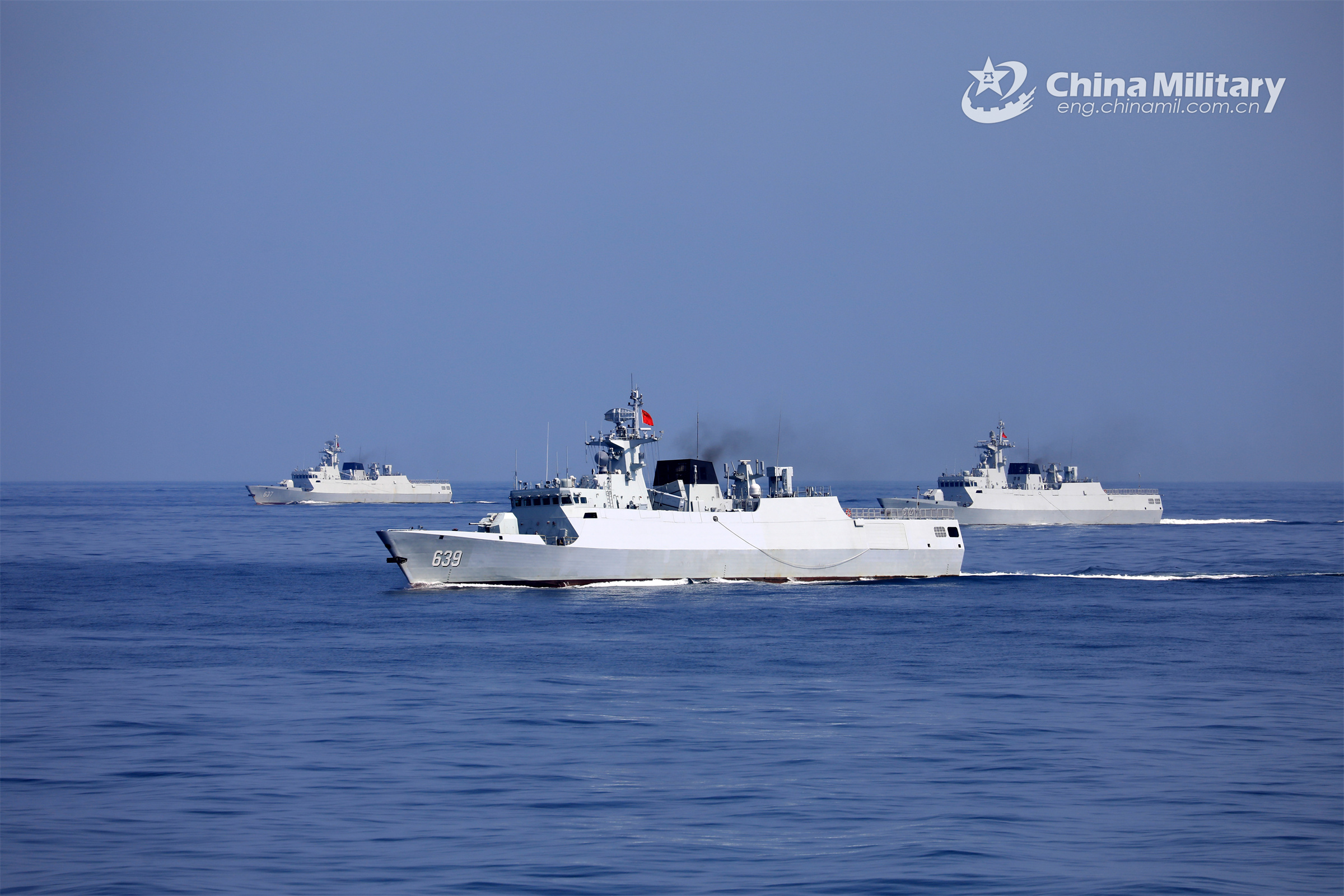 Three vessels attached to a frigate flotilla with the navy under the PLA Eastern Theater Command, including the guided-missile frigates Zhuzhou, Shuozhou and Shiyan, steam forward in an undisclosed sea area during a real-combat training exercise in August. (eng.chinamil.com.cn/Photo by Ren Wei)