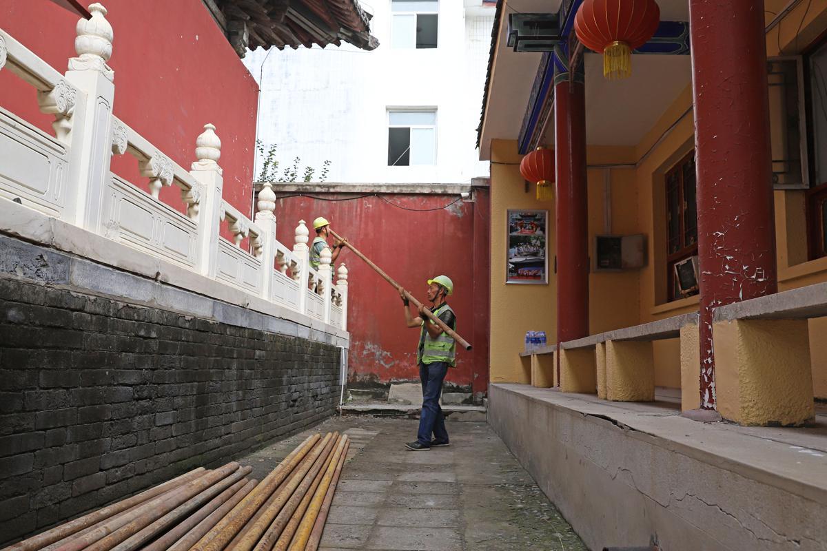 A worker removes scaffolding after completing the repair work at Qingxinggong in Zhuozhou, Hebei province on Monday. [Photo by Xiong Huaming/For chinadaily.com.cn]