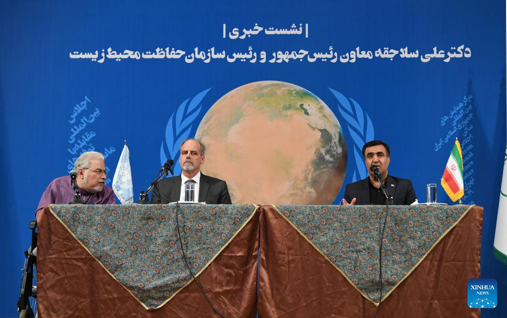 Ali Salajegheh (R), Iranian vice president and head of the Department of Environment (DoE), and Stefan Priesner (C), the United Nations resident coordinator for Iran, attend a press conference ahead of the International Conference on Combating Sand and Dust Storms in Tehran, Iran, on Sept. 5, 2023. Iran and China have "good capacities" for environmental cooperation, especially in combating dust and sand storms, said Ali Salajegheh, Iran's vice president and head of the Department of Environment (DoE). (Xinhua/Shadati)