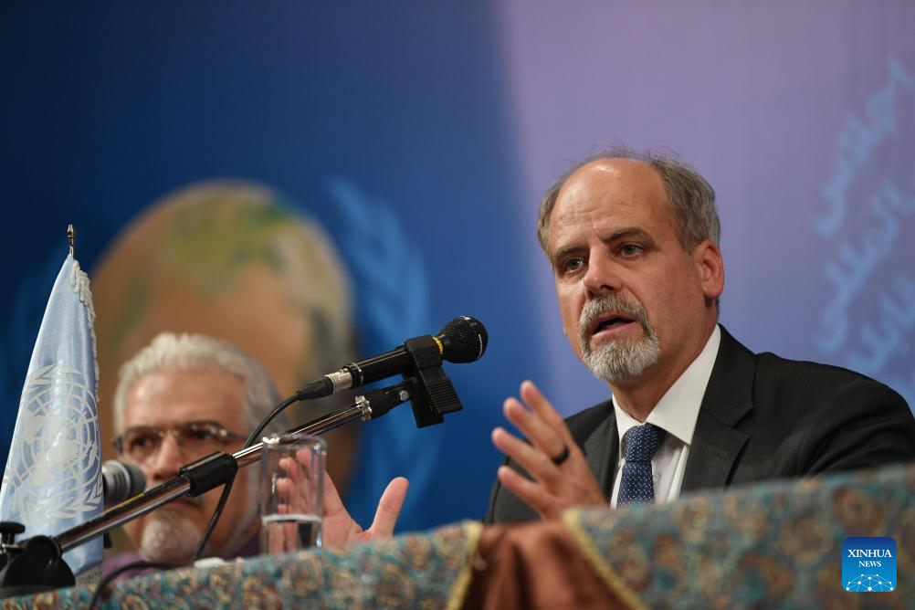 Stefan Priesner (R), the United Nations resident coordinator for Iran, speaks at a press conference ahead of the International Conference on Combating Sand and Dust Storms in Tehran, Iran, on Sept. 5, 2023. Iran and China have "good capacities" for environmental cooperation, especially in combating dust and sand storms, said Ali Salajegheh, Iran's vice president and head of the Department of Environment (DoE). (Xinhua/Shadati)