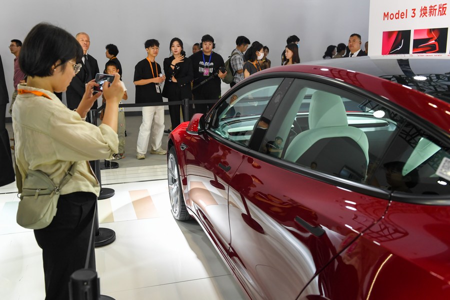 Visitors learn about a new vehicle of Tesla during the 2023 China International Fair for Trade in Services (CIFTIS) at China National Convention Center in Beijing, capital of China, Sept. 3, 2023. (Xinhua/Ju Huanzong)