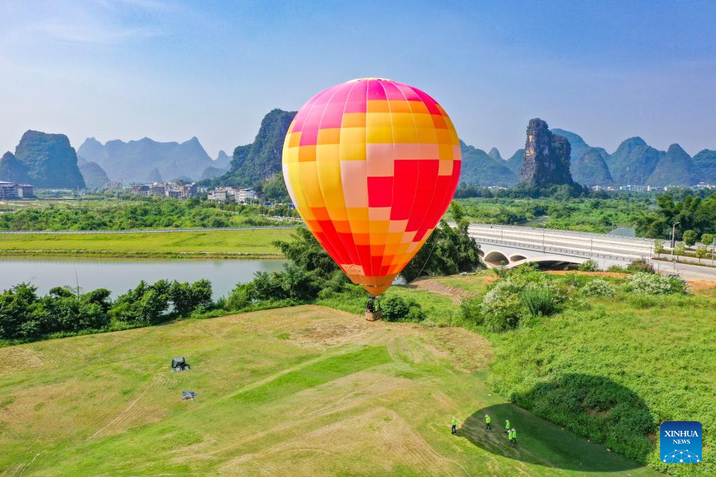 Tourists take a hot air balloon in Guilin, south China's Guangxi Zhuang Autonomous Region, Sept. 5, 2023. (Xinhua/Hu Xingyu)
