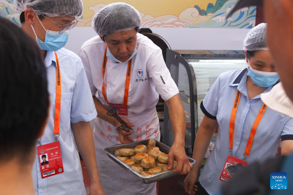 Staff members serve freshly baked meat pies at the exhibition hall of Beijing time-honored brand during the 2023 China International Fair for Trade in Services (CIFTIS) in Beijing, capital of China, Sept. 6, 2023. A number of time-honored brands in catering business made their debut at the exhibition hall of Beijing time-honored brand during the 2023 CIFTIS, attracting numerous guests to come for a taste. (Xinhua/Cen Yunpeng)