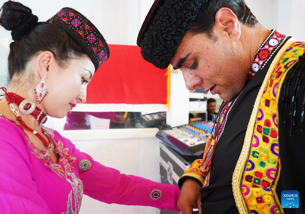 Bahtiyar Jumahan and his wife Gulbanur Kurqak get prepared before a performance in Taxkorgan Tajik Autonomous County, northwest China's Xinjiang Uygur Autonomous Region, Sept. 4, 2023. (Xinhua/Jin Haoyuan)