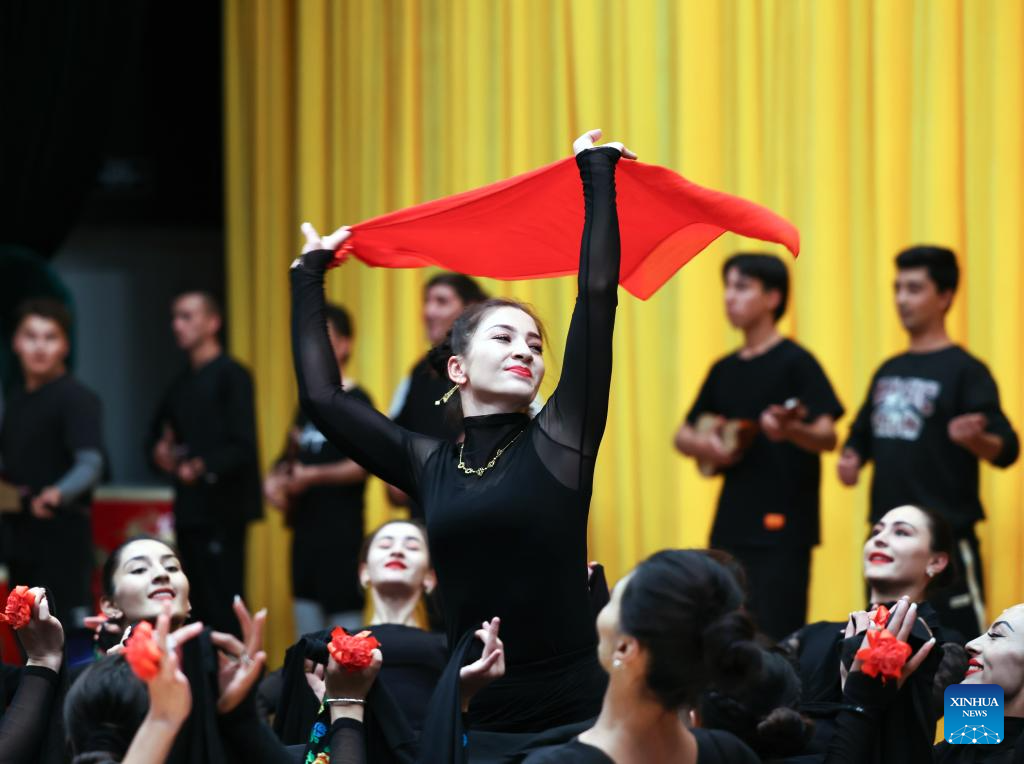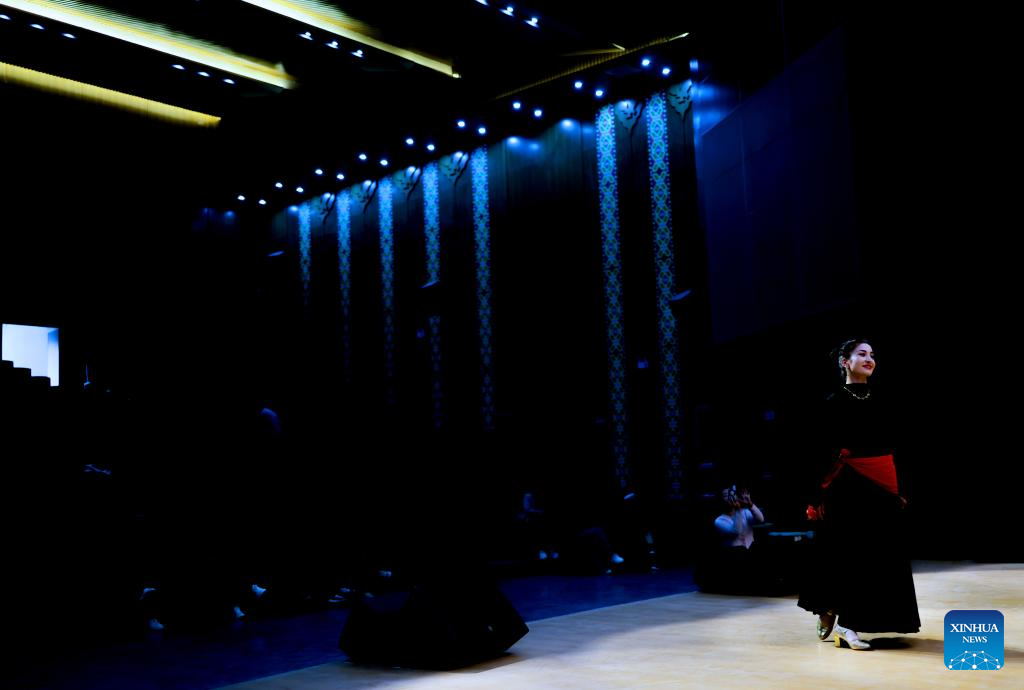 Gulbanur Kurqak rehearses a dance program at a theatre in Taxkorgan Tajik Autonomous County, northwest China's Xinjiang Uygur Autonomous Region, Sept. 4, 2023. (Xinhua/Lan Hongguang)