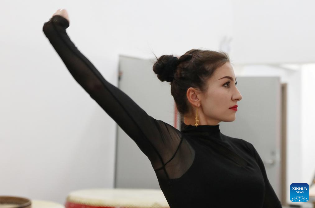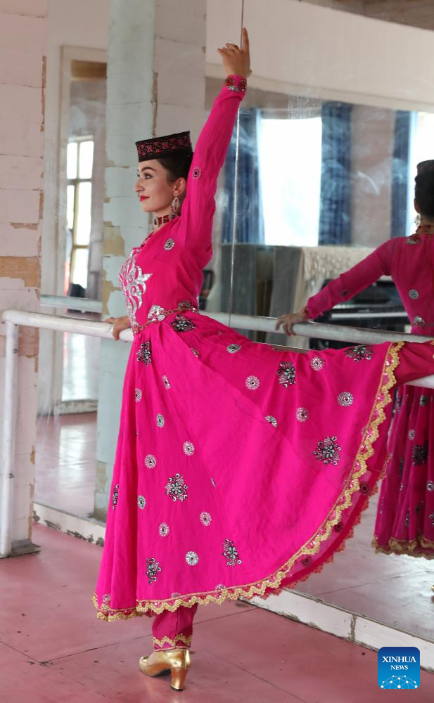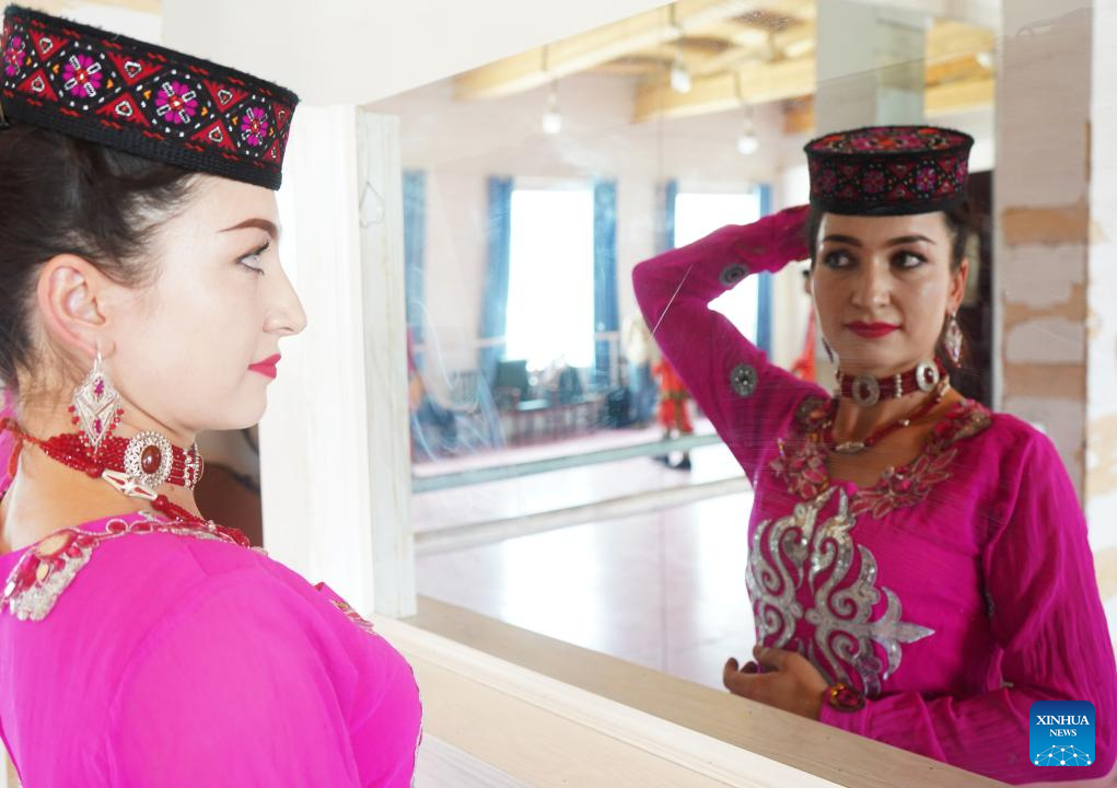 Gulbanur Kurqak rehearses a dance program in Taxkorgan Tajik Autonomous County, northwest China's Xinjiang Uygur Autonomous Region, Sept. 4, 2023. (Xinhua/Lan Hongguang)