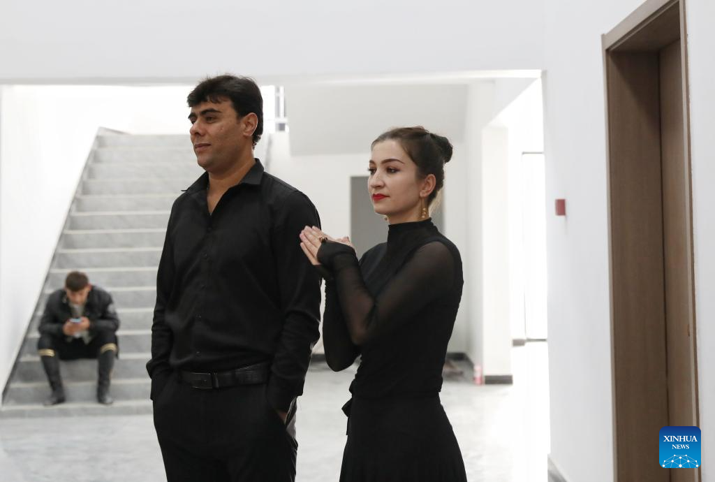 Bahtiyar Jumahan and his wife Gulbanur Kurqak watch a dance rehearsal in Taxkorgan Tajik Autonomous County, northwest China's Xinjiang Uygur Autonomous Region, Sept. 4, 2023. (Xinhua/Cheng Tingting)