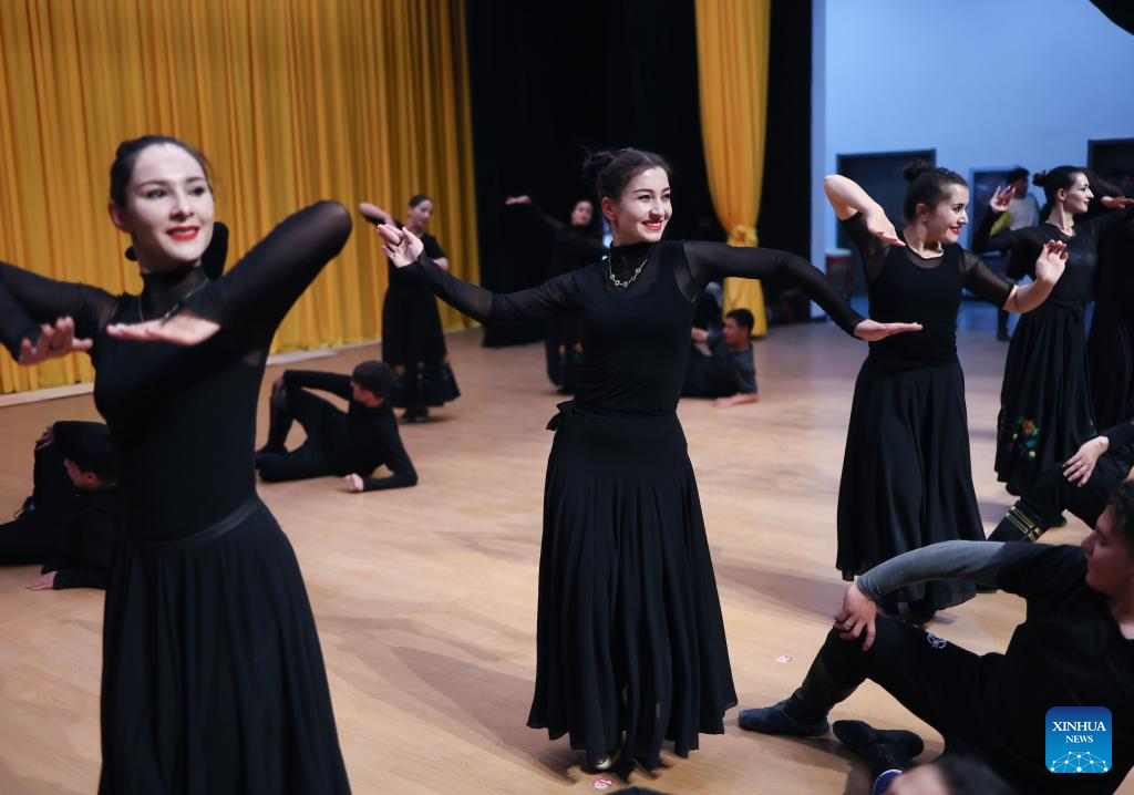 Gulbanur Kurqak and other dancers rehearse a dance program in Taxkorgan Tajik Autonomous County, northwest China's Xinjiang Uygur Autonomous Region, Sept. 4, 2023. (Xinhua/Lan Hongguang)