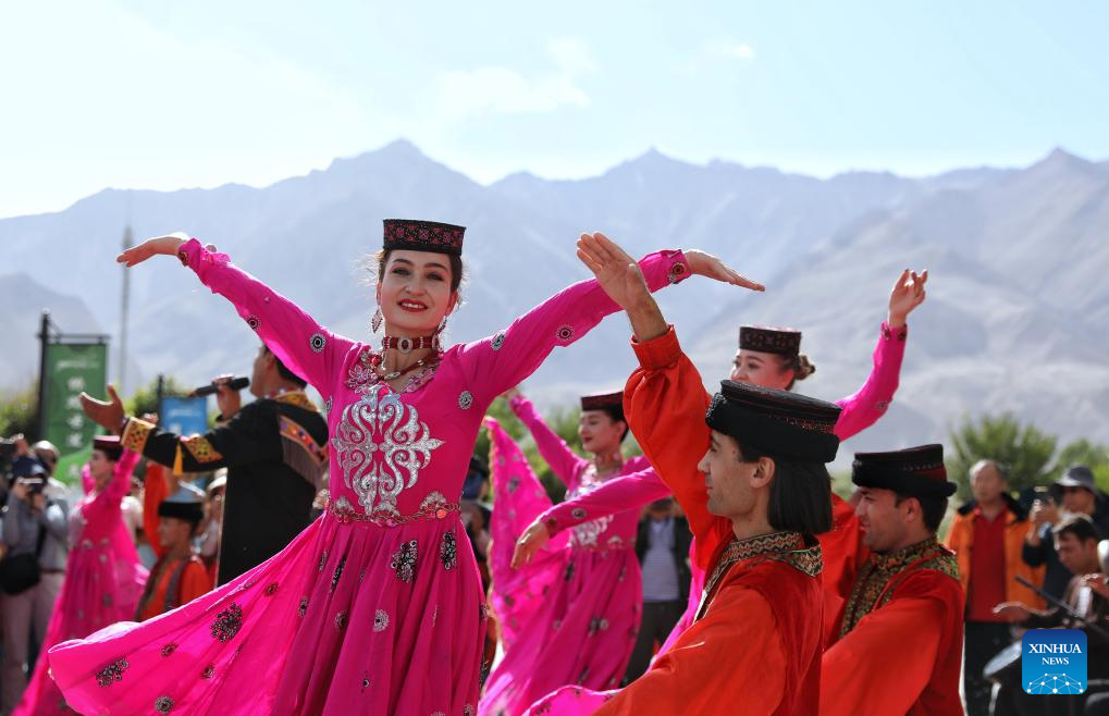 Gulbanur Kurqak and other dancers perform to welcome tourists in Taxkorgan Tajik Autonomous County, northwest China's Xinjiang Uygur Autonomous Region, Sept. 4, 2023. (Xinhua/Cheng Tingting)