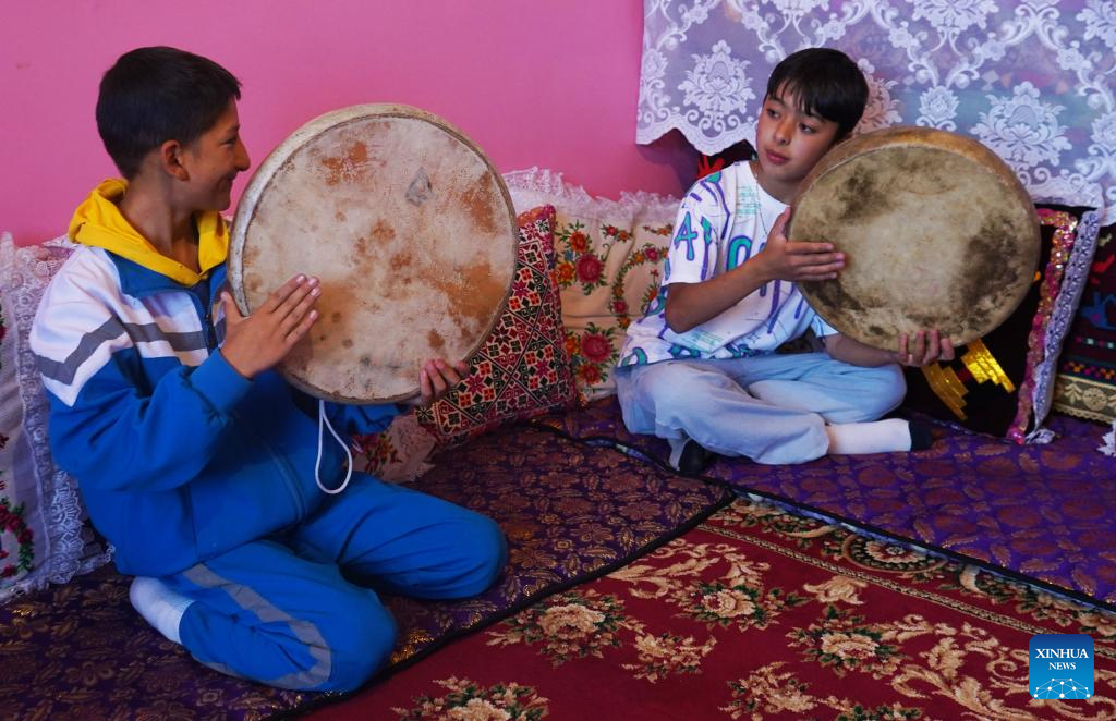 Bahtiyar Jumahan's son (R) and his cousin beat drums in Taxkorgan Tajik Autonomous County, northwest China's Xinjiang Uygur Autonomous Region, Sept. 4, 2023. (Xinhua/Jin Haoyuan)