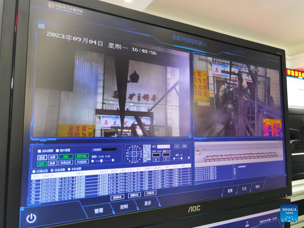 A screen displays the images delivered by a robot patrolling the main slope at Malan coal mine of Shanxi Coking Coal Xishan Coal Electricity Group Co., Ltd. in Gujiao City, north China's Shanxi Province, Sept. 4, 2023. (Xinhua/Wang Xuetao)