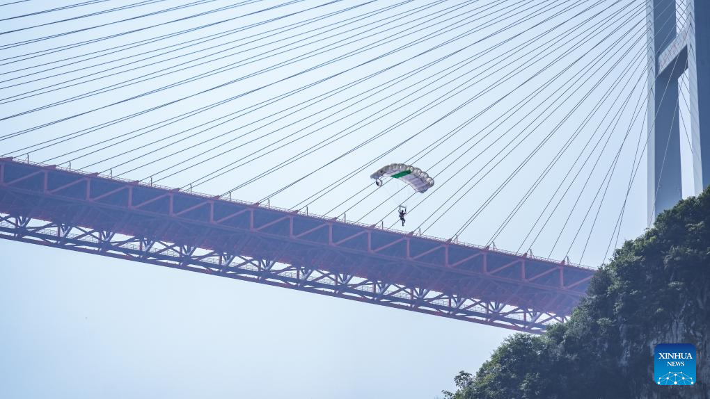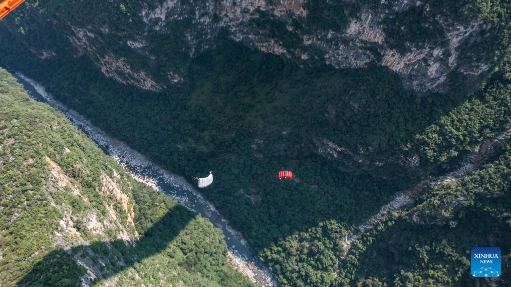 Athletes take part in the 2023 International High Bridge Extreme Sports Invitational Tournament in Liupanshui, southwest China's Guizhou Province, Sept. 7, 2023. A total of 25 athletes from 11 countries and regions, including Italy, France, Canada and the United States, came to China's Beipanjiang Bridge to participate in the 2023 International High Bridge Extreme Sports Invitational Tournament. (Xinhua/Tao Liang)