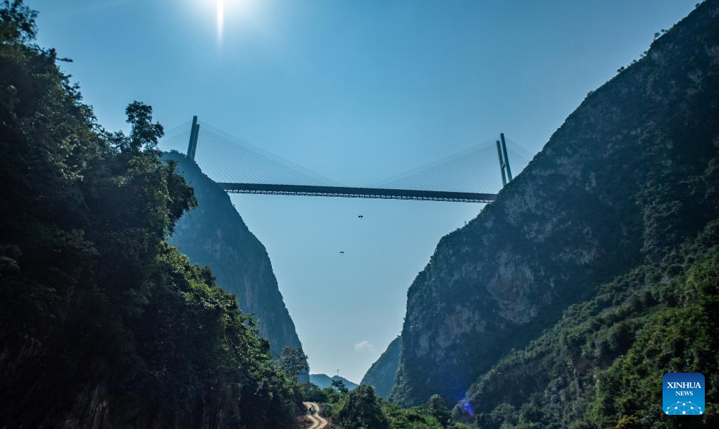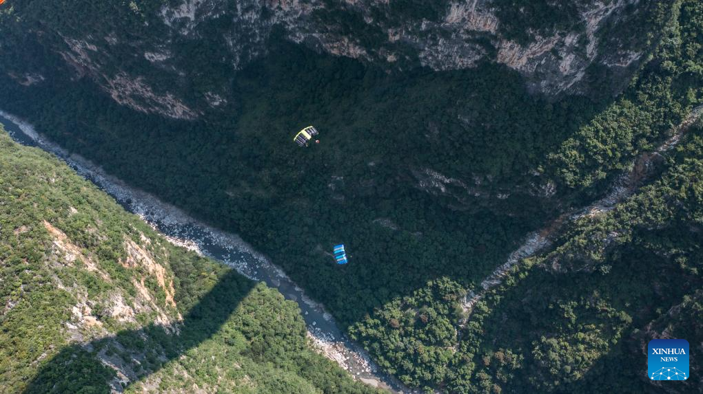 The aerial photo taken on Sept. 6, 2023 shows that athletes take part in the 2023 International High Bridge Extreme Sports Invitational Tournament in Liupanshui, southwest China's Guizhou Province. A total of 25 athletes from 11 countries and regions, including Italy, France, Canada and the United States, came to China's Beipanjiang Bridge to participate in the 2023 International High Bridge Extreme Sports Invitational Tournament. (Xinhua/Tao Liang)