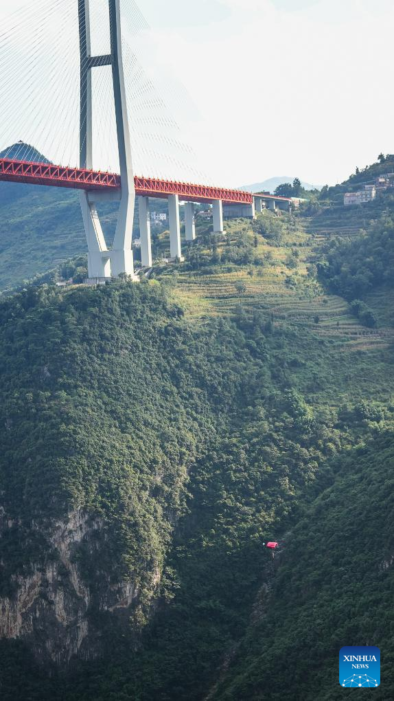 The aerial photo taken on Sept. 6, 2023 shows that an athlete takes part in the 2023 International High Bridge Extreme Sports Invitational Tournament in Liupanshui, southwest China's Guizhou Province. A total of 25 athletes from 11 countries and regions, including Italy, France, Canada and the United States, came to China's Beipanjiang Bridge to participate in the 2023 International High Bridge Extreme Sports Invitational Tournament. (Xinhua/Tao Liang)